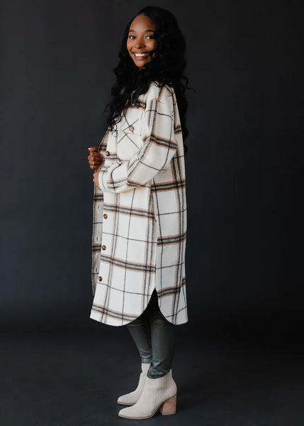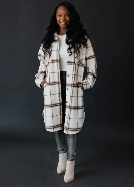 A classic flannel feel with a gorgeous tan & olive coloring. Featuring a long length design, this flannel also offers two side pockets, and full button closure. They run true to sized with a relaxed fit. April is 5'9" with long arms wearing a medium, Sarah is wearing a small.