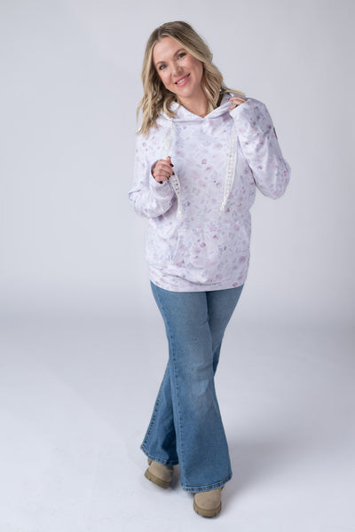 Stay cozy and stylish this spring with the Hailey Pullover Hoodie. Made with triple stretch for maximum comfort, this hoodie features the full blush floral print and added crochet strings! Pair it with your favorite jeans and booties this spring!