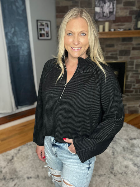 The trend that is in and for good reason- two toned ribbed material! We are a big fan of this quarter zip paired with a sweater vibe! This can easily be dressed up or down. Runs true to size with a relaxed fit. April is 5'9" wearing a medium.
