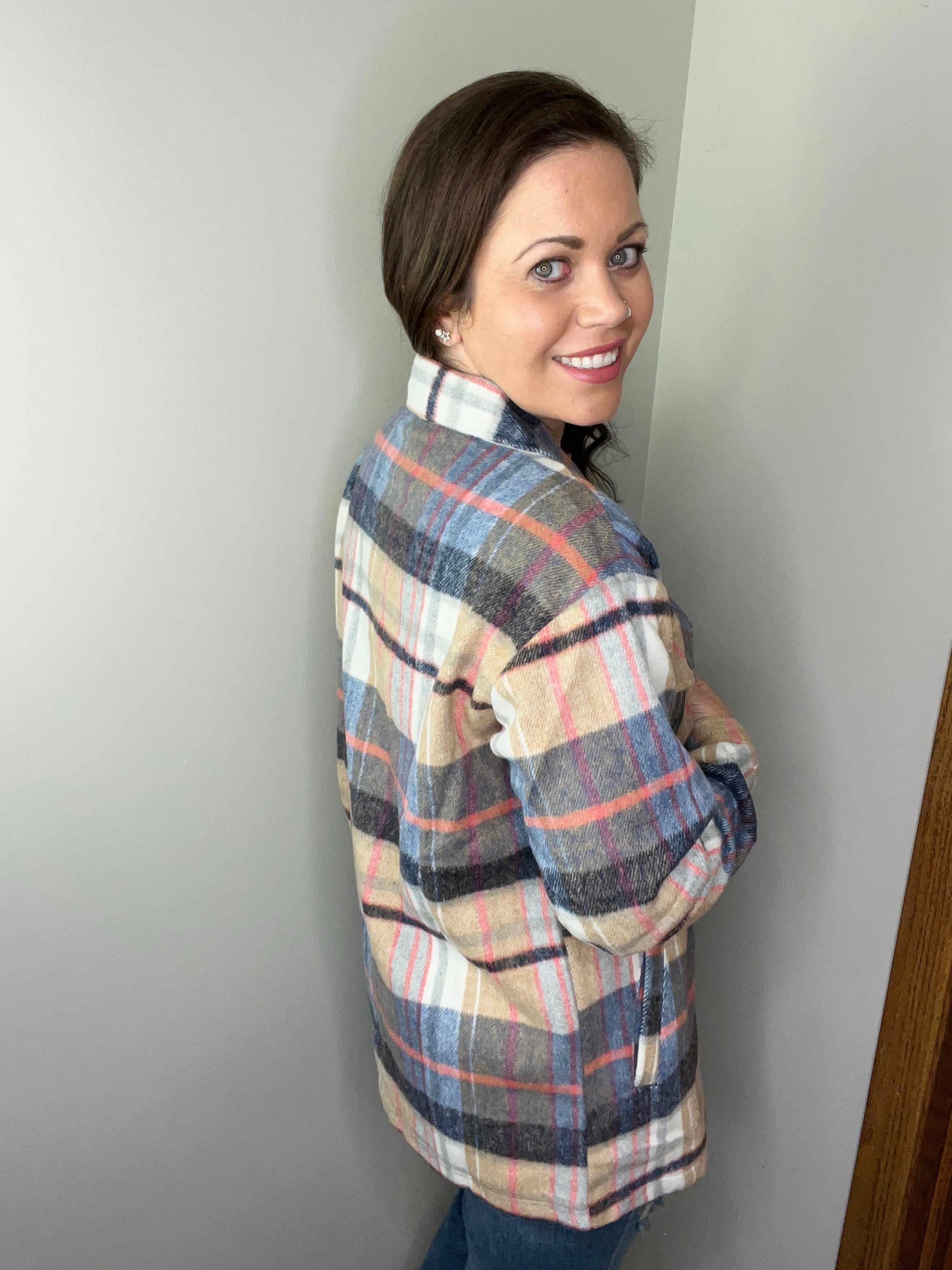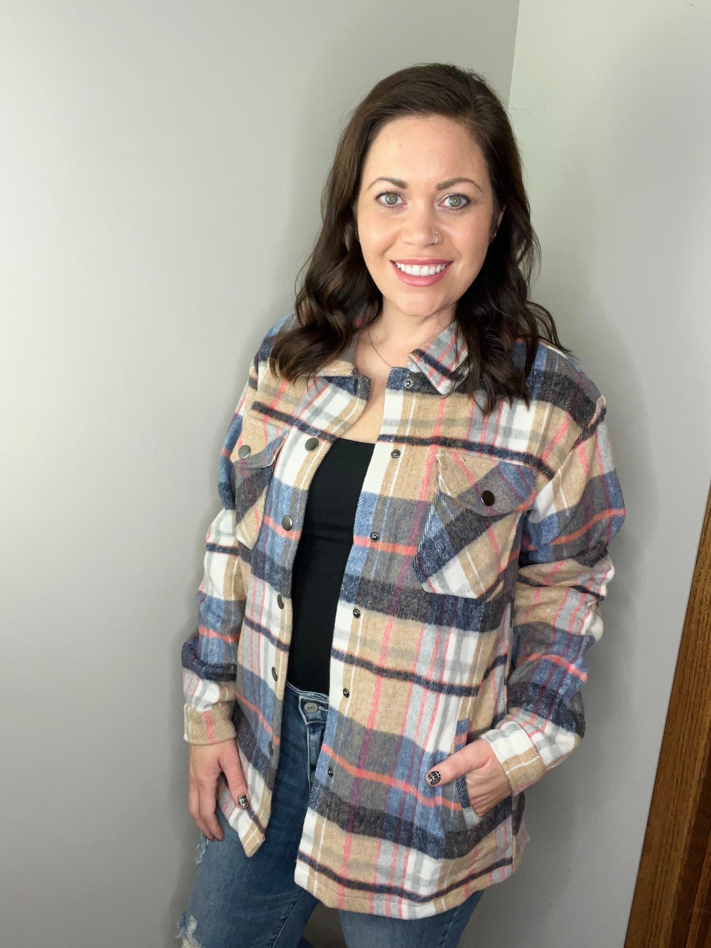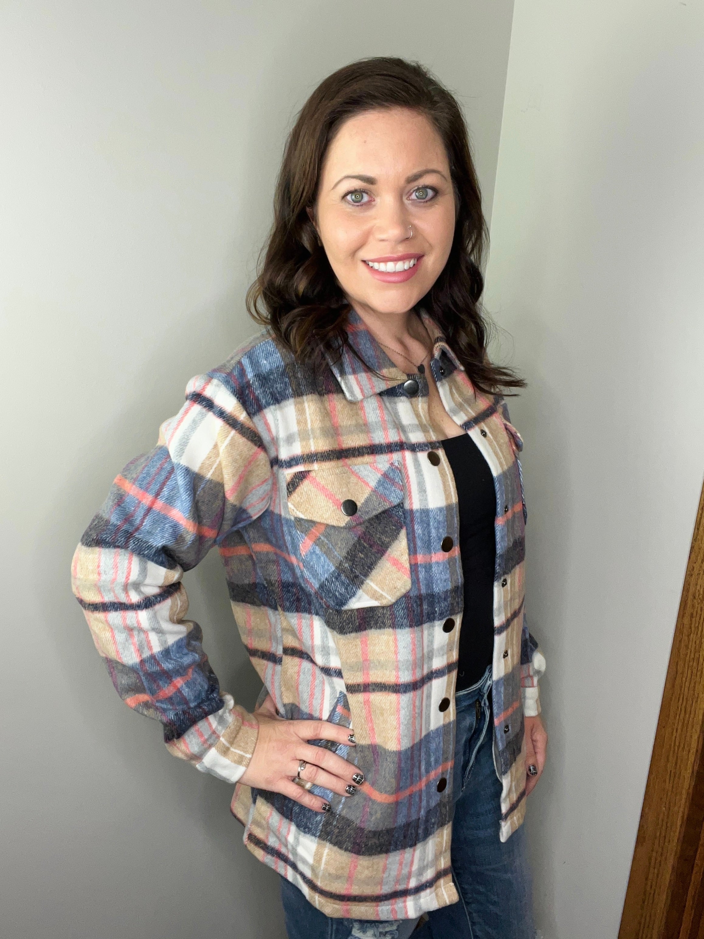 Meet Norah, our custom-cut shacket! This is a Michelle Mae exclusive, and you cannot get our fit anywhere else! This has a relaxed fit design, making it great for layering. It has features of a straighter bottom hem, snap buttons that are functioning and the two front upper pockets are fold over, functioning pockets with a snap button! This shacket has colors of blue, tan, and orange. Megan is wearing a small.