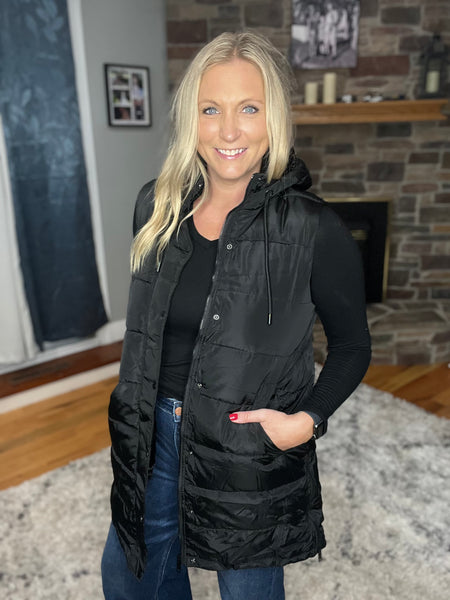 Be cozy, warm, and cute all at once! Our favorite style puffer vest in long length now offers a polar fleece lining, a hood, zip closure, and side pockets. There is absolutely nothing you won't adore about this one! Runs true to size with a relaxed fit. Megan is wearing a small.