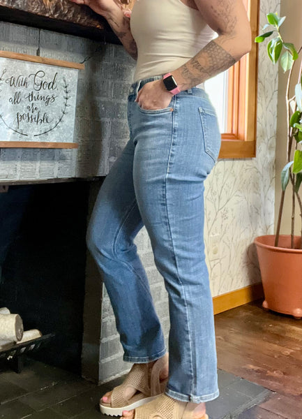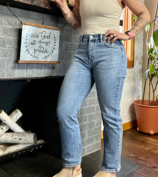 With a gap-proof waistband in smoothing denim, these will be your new favorite fit. Super stretchy comfort denim with a hidden elastic waistband (great for people with a large size different between their legs/butt and waist). Medium stone wash, ankle length styling and a twist inseam detail, there's nothing not to love about these. By securing the pocket lining to the J-stitch, this construction helps to flatten and shape the midsection while maintaining a natural and comfortable fit--the tummy control fit that well know and adore. The result is a pair of jeans that enhances your silhouette and provides the structure and support you need for all-day confidence. We think these one's fit a bit more snug than the other versions of the Artemis Vintage jeans. We suggest ordering your normal jeans size (size up from your Judy blue size)