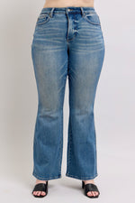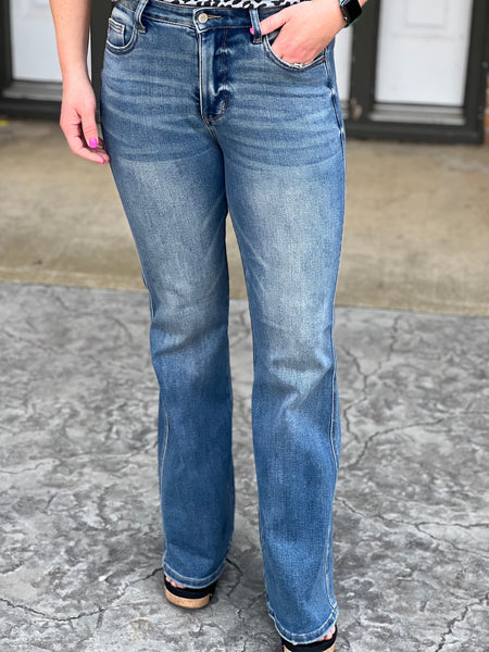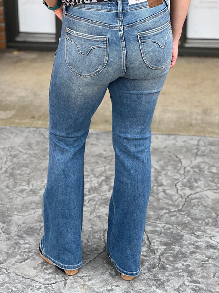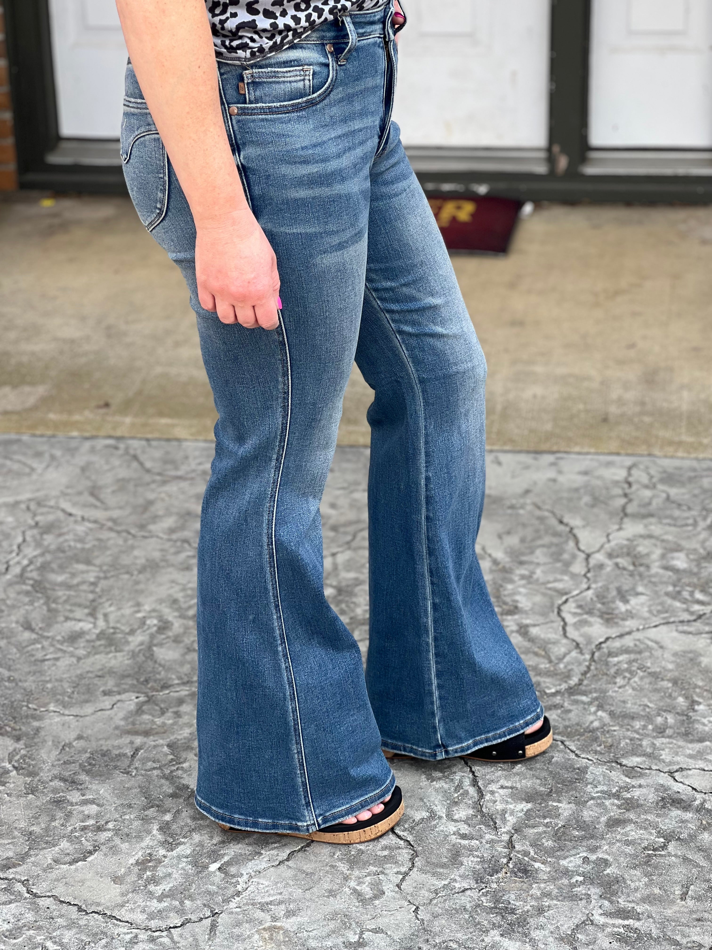 Judy Blue nailed it with these flare jeans and left no detail out! They feature a comfortable tummy control panel that is not too high, booty lifting back pockets, a super soft and stretchy material, zero distressing, and the perfect flare that you can dress up or down! They run true to your Judy Blue size (see below).