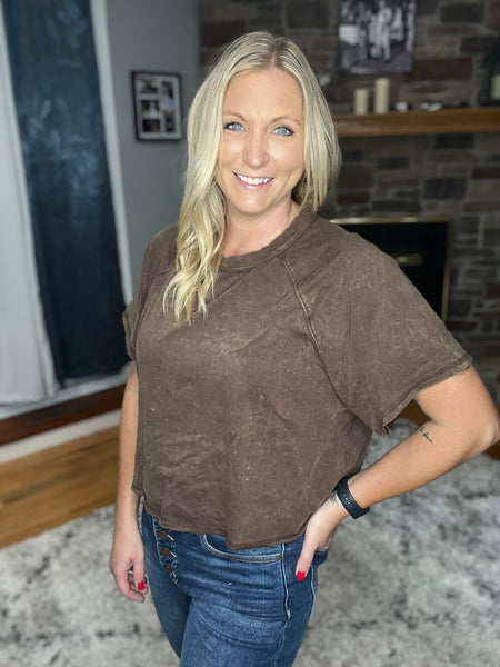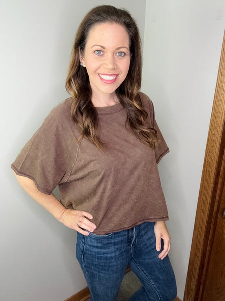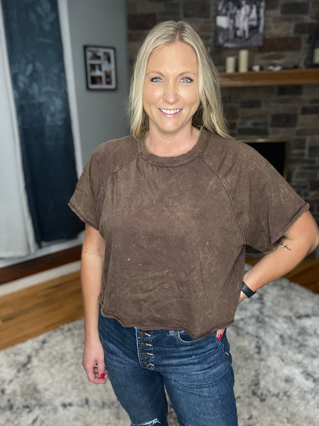 This acid wash tee in mahogany is the perfect piece to add to your fall lineup! The days that are still warm, but autumn is in the air! With a dolman style sleeve, round hem, and semi-cropped front, this transitional piece can be easily dressed up or down! Runs true to size with a relaxed fit. April is 5'9" wearing the L/XL. Megan is wearing a S/M.