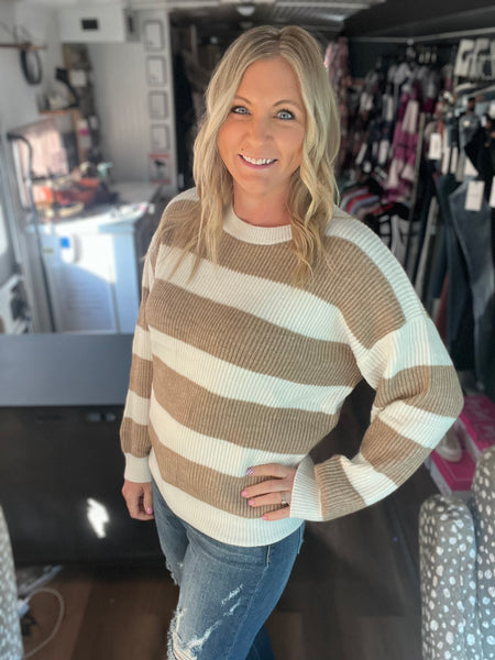 Get ready for the fall season with this cozy Tan and Ivory Stripe Sweater! With chunky stripes and a soft feel, this sweater is perfect for creating a stylish and comfortable look. Embrace the autumn vibes with this must-have wardrobe piece.