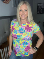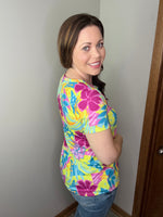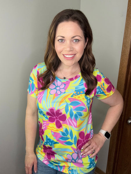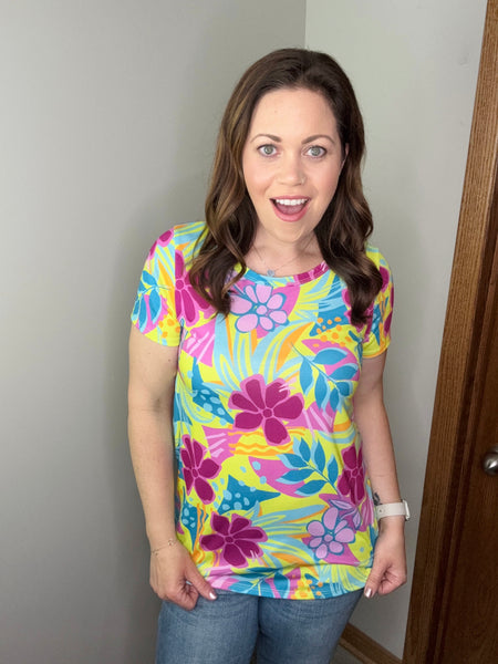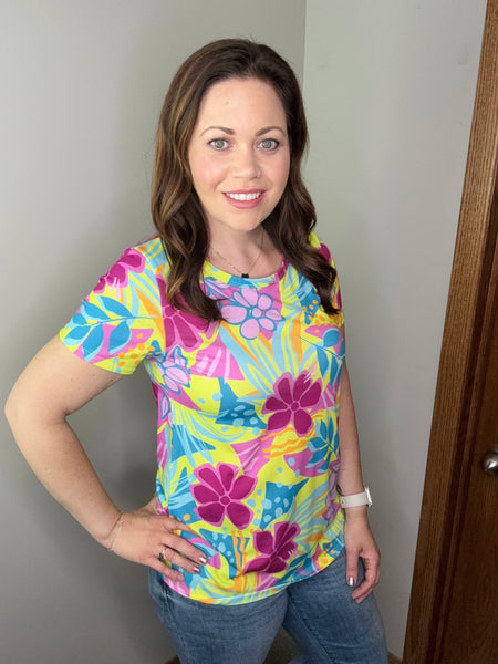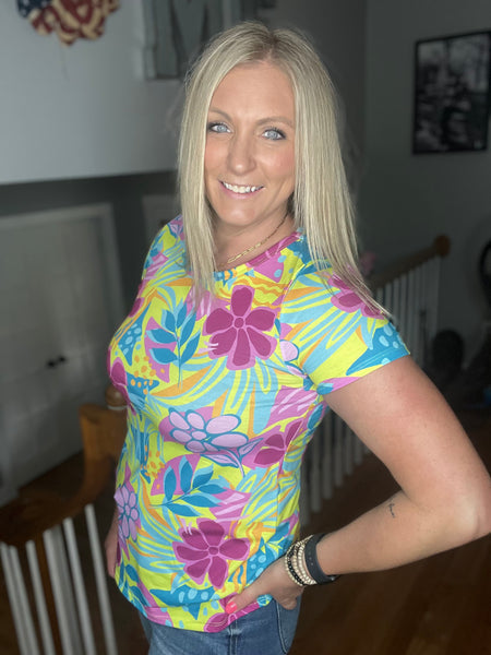 This vibrant short-sleeve tee bursts with tropical energy and retro flair. Covered in a bold all-over print, the design features oversized hibiscus-style flowers, abstract geometric shapes, and sweeping leaf motifs in a palette of hot pink, turquoise, yellow, lavender, and aqua blue. The playful mix of bright and pastel tones gives off a nostalgic, summery feel. Megan is wearing a small. April is wearing a medium.