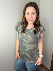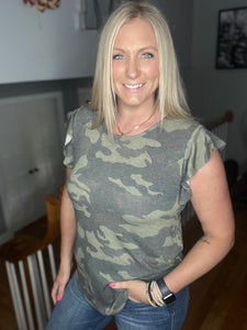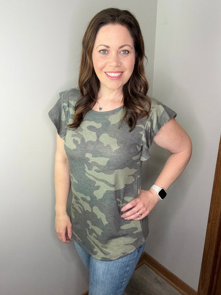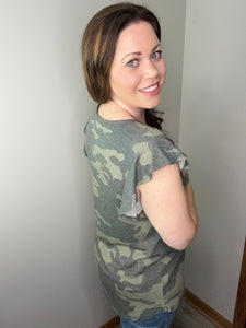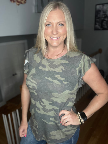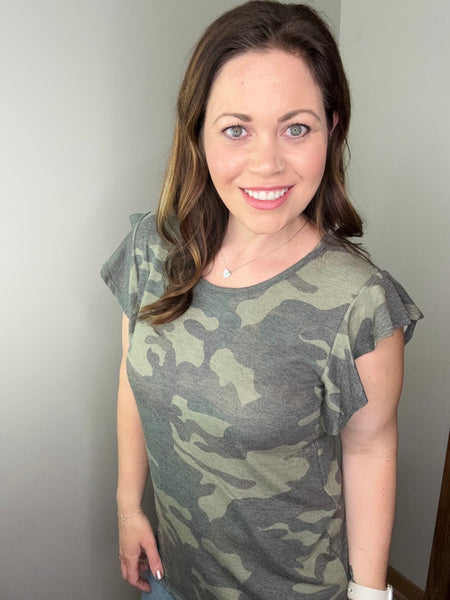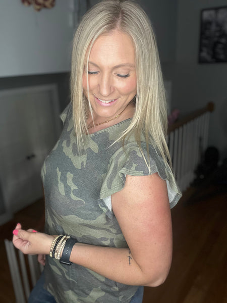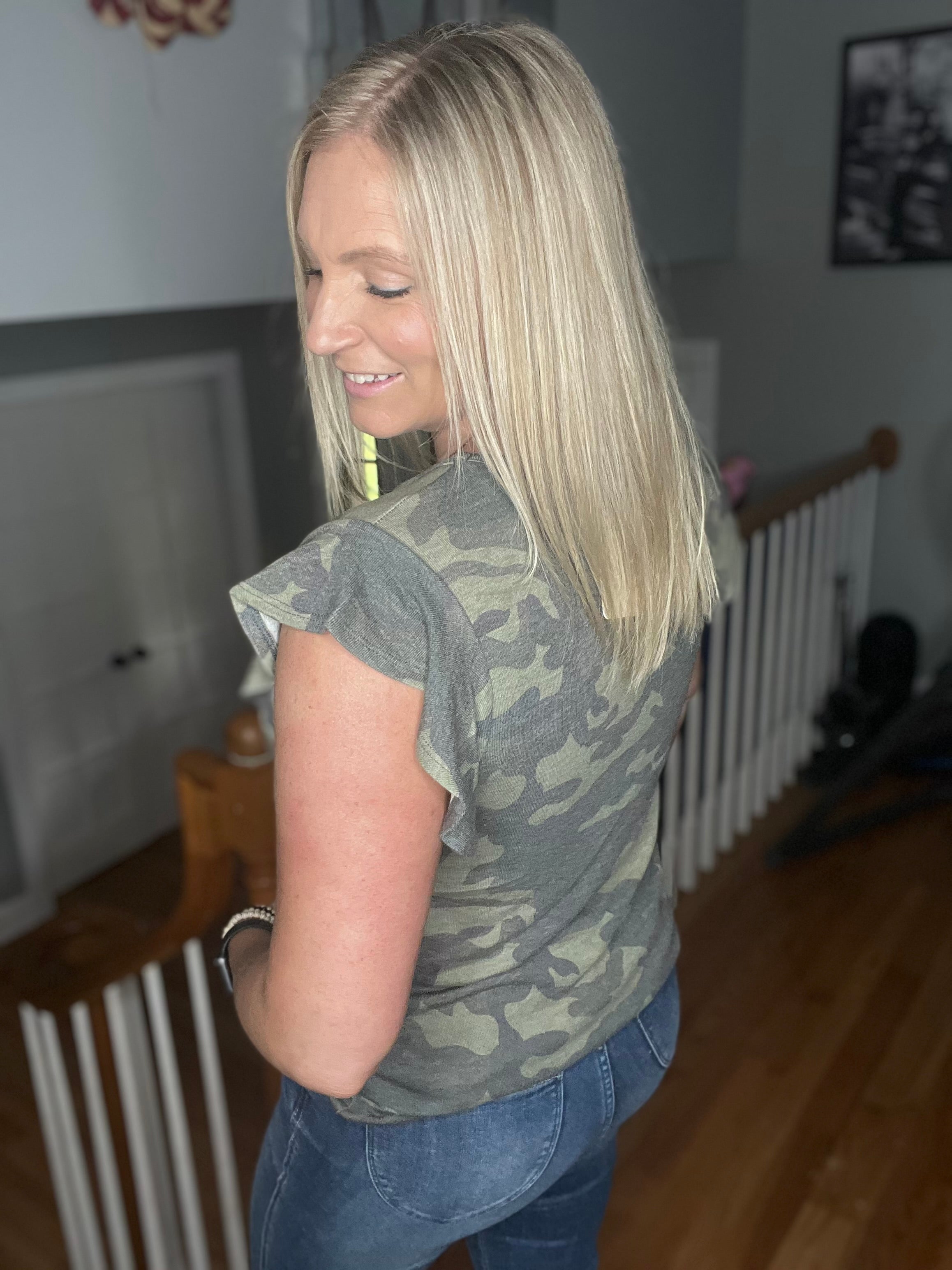 Stay effortlessly cool in the Urban Drift Camo Tee. This soft, lightweight top features a subtle camo print with a relaxed fit and flutter-style short sleeves for a feminine touch. Perfect for layering or wearing solo, it pairs seamlessly with jeans or leggings. Megan is wearing a small. April is wearing a medium.