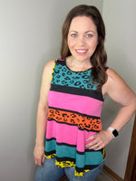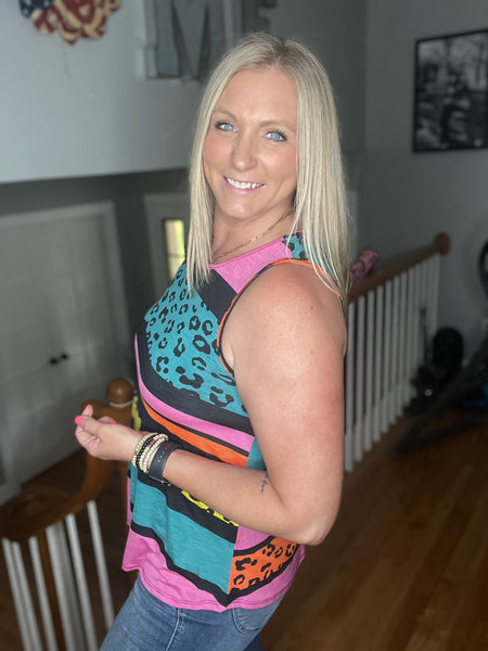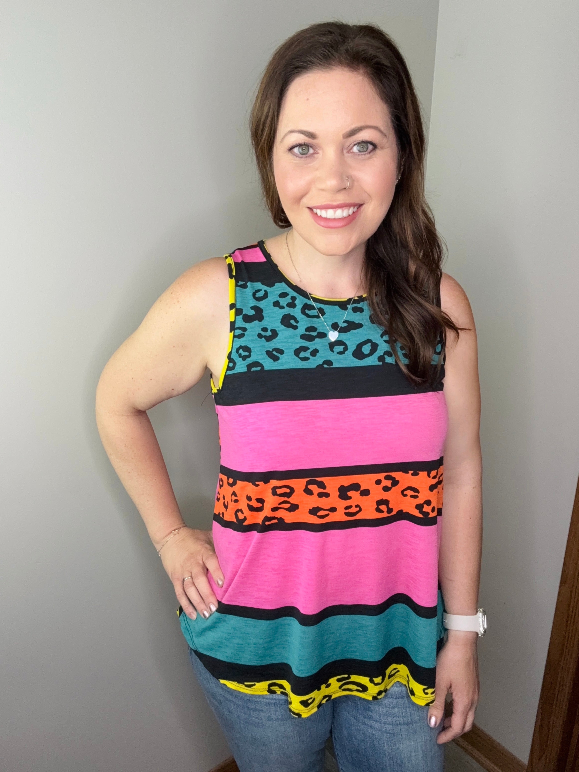 This eye-catching tank top features a bold and playful colorblock design with alternating stripes of vivid colors and animal print. The colors include hot pink, orange, turquoise, and black, with two of the color bands featuring leopard print patterns—orange with black leopard spots and teal with black leopard spots. Megan is wearing a small. April is wearing a medium.